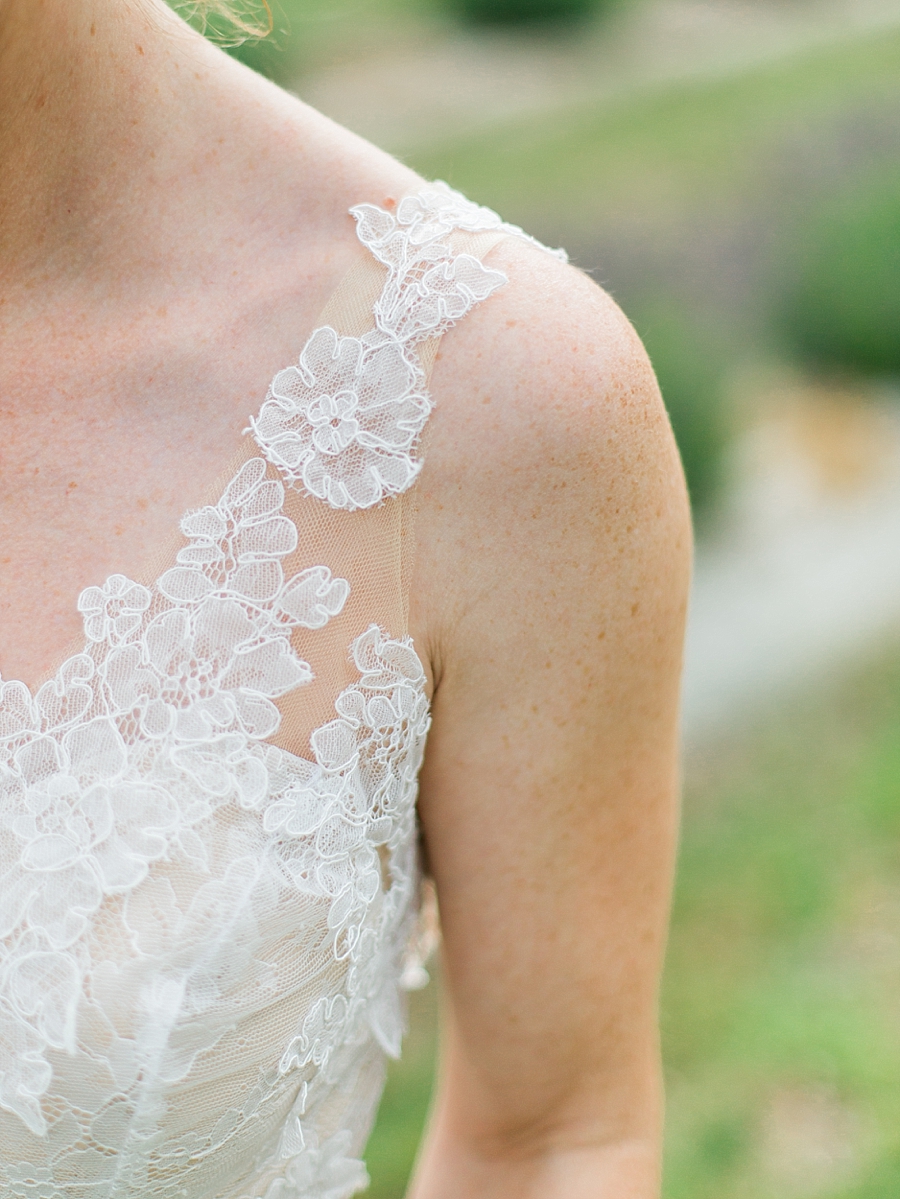 Inspiring touches of the lavender color palette are throughout the table decor … the spreading table centerpiece with it’s intrinsically detailed buds, tiny blooms, and lacy petals in complementing colors, the organic beauty of the lavender bundles against the beautiful detail of the Vietri plates, and the heirloom table runner bringing together all of the feminine beauty. The delicate lace of the Monique Lhuillier gown pairs perfectly with the bride’s billowing veil, while selective yet statement jewelry adds the perfect touch of glamour. Our flower girl dances through the scenes in her floral crown and white dress wrapped in Frou Frou Chic silk, scattering smiles and lavender blossoms as she goes. The bars of lavender infused soap were guest favors, and as the hot summer night ended, guests enjoyed lavender ice cream and a simple cake adorned with fresh blackberries.