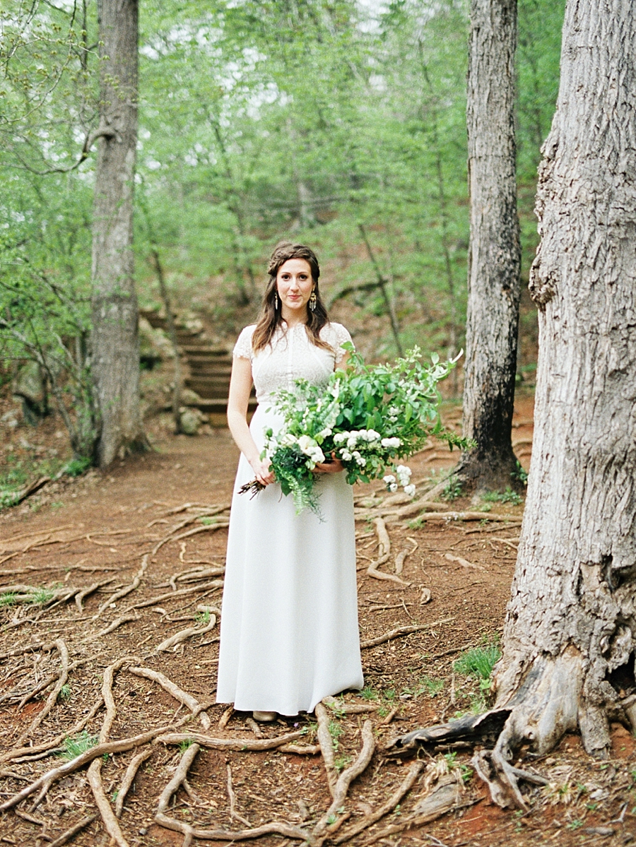 These words from Ruth in the Bible were part of the inspiration for this intimate, woodland elopement shoot. We wanted to convey a sense of simplicity and tranquility – one where the attention was fully devoted to the couple and their relationship with each other. It was also to convey the beginning of an adventure together – one where both were fully committed to each other in their marriage relationship, in acts of self sacrifice. At a table for two, they sat along the waters edge celebrating what was going to be their new life together. Fresh figs, cheese, and meats created a portable yet elegant meal for the two of them. Ferns, moss, and woodland flowers filled the table with small and delicate details. They read vows to each other that they wrote specifically for the occasion, and he led her through winding paths to the waters edge, where in their first act of commitment to each other he gently washed her feet with fragrant herbs. The foraged bouquet included apple branches and other items selected from the woods around them. At the end of their day, they kissed in the rushing water, and the greatest adventure of their life began.